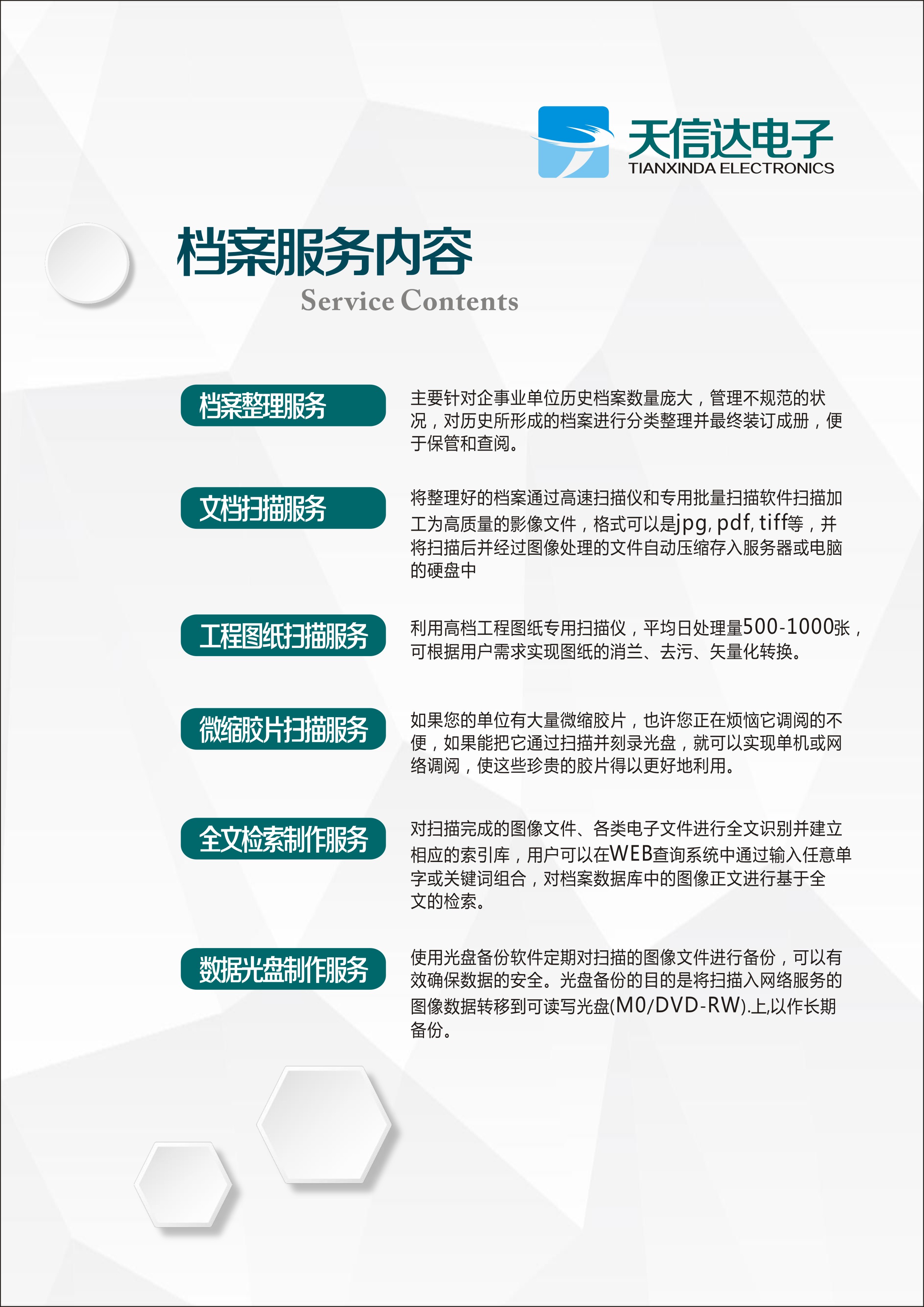 档案整理服务、文档扫描服务、工程图纸扫描服务、微缩胶片扫描服务、全文检索制作服务、数据光盘制作服务